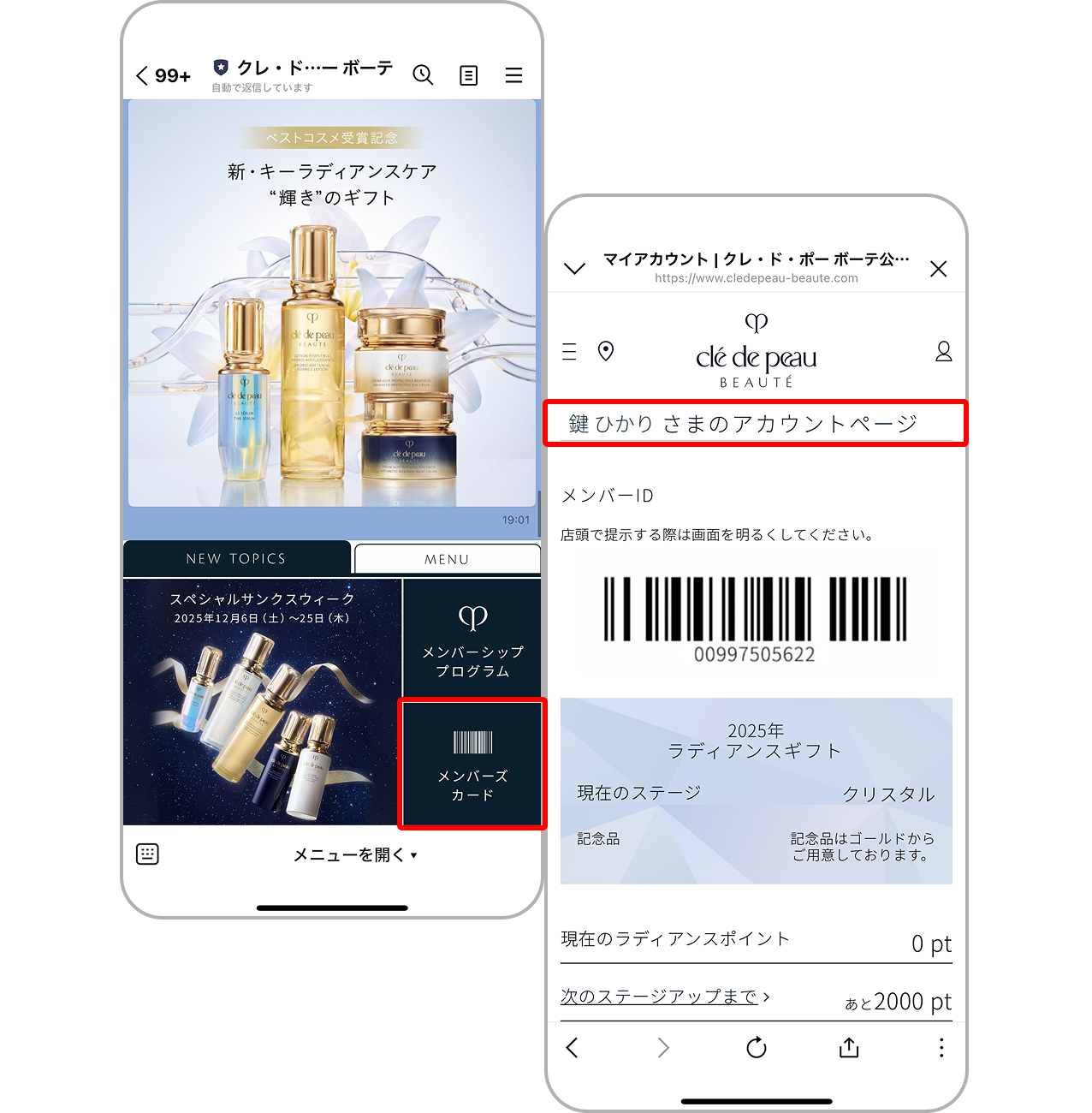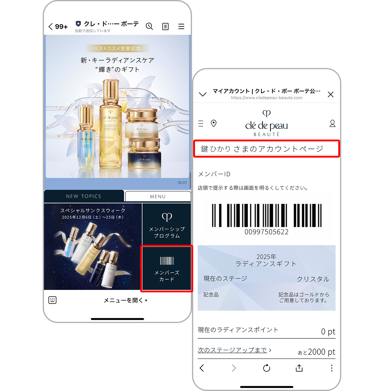 - クレ・ド・ポー ボーテ メンバーシッププログラム参加店(以下、「参加店」といいます)の店舗およびオンラインショップが対象です。なお、参加店のオンラインショップでのクレ・ド・ポー ボーテ商品購入に関してラディアンスポイントを獲得するためには、会員本人が、会員情報(クレ・ド・ポー ボーテ メンバーシッププログラムにご登録済みのBeauty Key会員の会員情報)と参加店のオンラインショップにおける登録情報との連携手続きを完了している必要がございます。