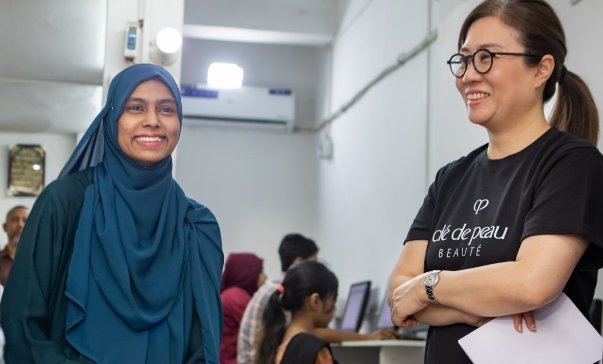 橋本は、ダッカのフィローザ・コンピューターにてラベヤさんと会合を行い、クレ・ド・ポー ボーテとユニセフのパートナーシップによるALPが、少女たちの生活にどのような影響を与えているかについて話を聞きました。