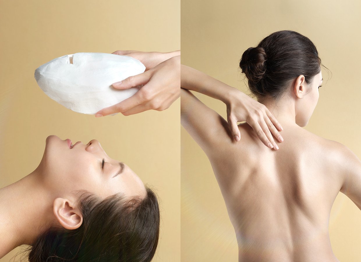 ネック&デコルテ用クリームとマッサージャーによるデコルテケアのあと、石膏マスクを塗布しハリのあるデコルテへ