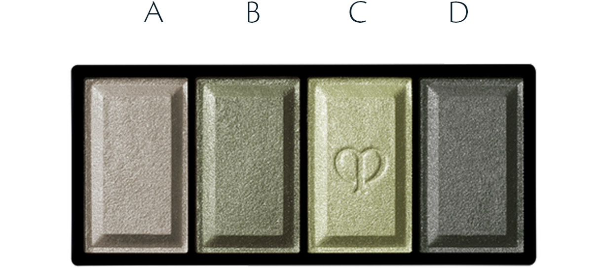 - ผสมเฉดสี A และ B จาก Eye Color Quad #315 แล้วไล้ลงบนเปลือกตาบน ไล้ผลิตภัณฑ์ให้เกินออกมาจากหางตาเพื่อสร้างดวงตาทรงเมล็ดอัลมอนด์ *เพื่อลุคที่โดดเด่นยิ่ง ไล้ผลิตภัณฑ์ตามแนวขนตาล่าง (หนึ่งในสามของพื้นที่เปลือกตาล่าง เริ่มจากหางตา)
